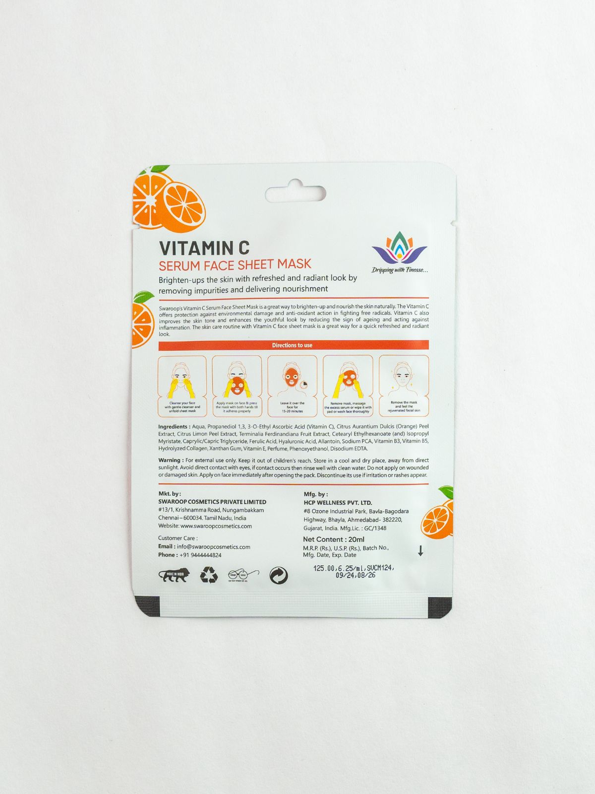 Swaroop’s Vitamin C Serum Face Sheet Mask is a great way to brighten-up and nourish the skin naturally. The Vitamin C offers protection against environmental damage and anti-oxidant action in fighting free radicals. Vitamin C also improves the skin tone and enhances the youthful look by reducing the sign of ageing and acting against inflammation. The skin care routine with Vitamin C face sheet mask is a great way for a refreshed and radiant look quickly.
